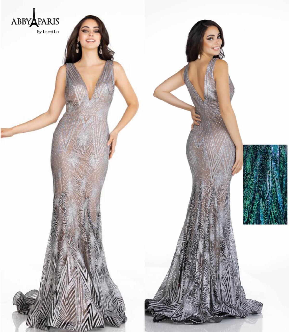- The fabric in this Abby Paris Prom and Evening by Lucci Lu dress is glitter Tulle
