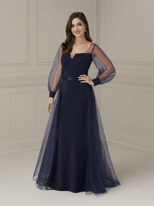Christina Wu Elegance navy evening dress features a slim silhouette in luxe crepe, with a notched square neckline and cuffed sheer bishop sleeves. The removable overskirt is fashioned in tulle and mesh, attached to a buckle belt and finished with a sweep train.